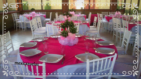 Montaje de mesas rectangular con mantel, sillas plegables.